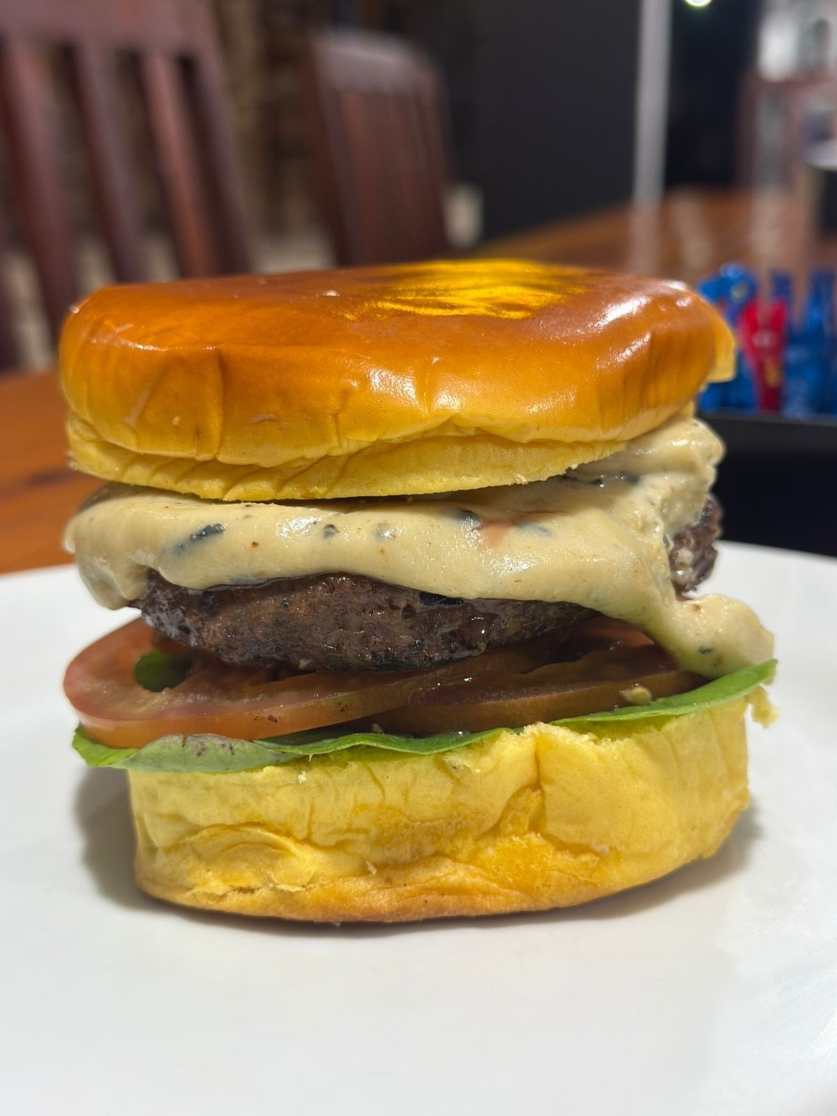 Pão, Hambúrguer de 150g, creme gorgonzola, Rúcula, tomate, creme de mostarda dijon trufado, Acompanha 150g de batata frita