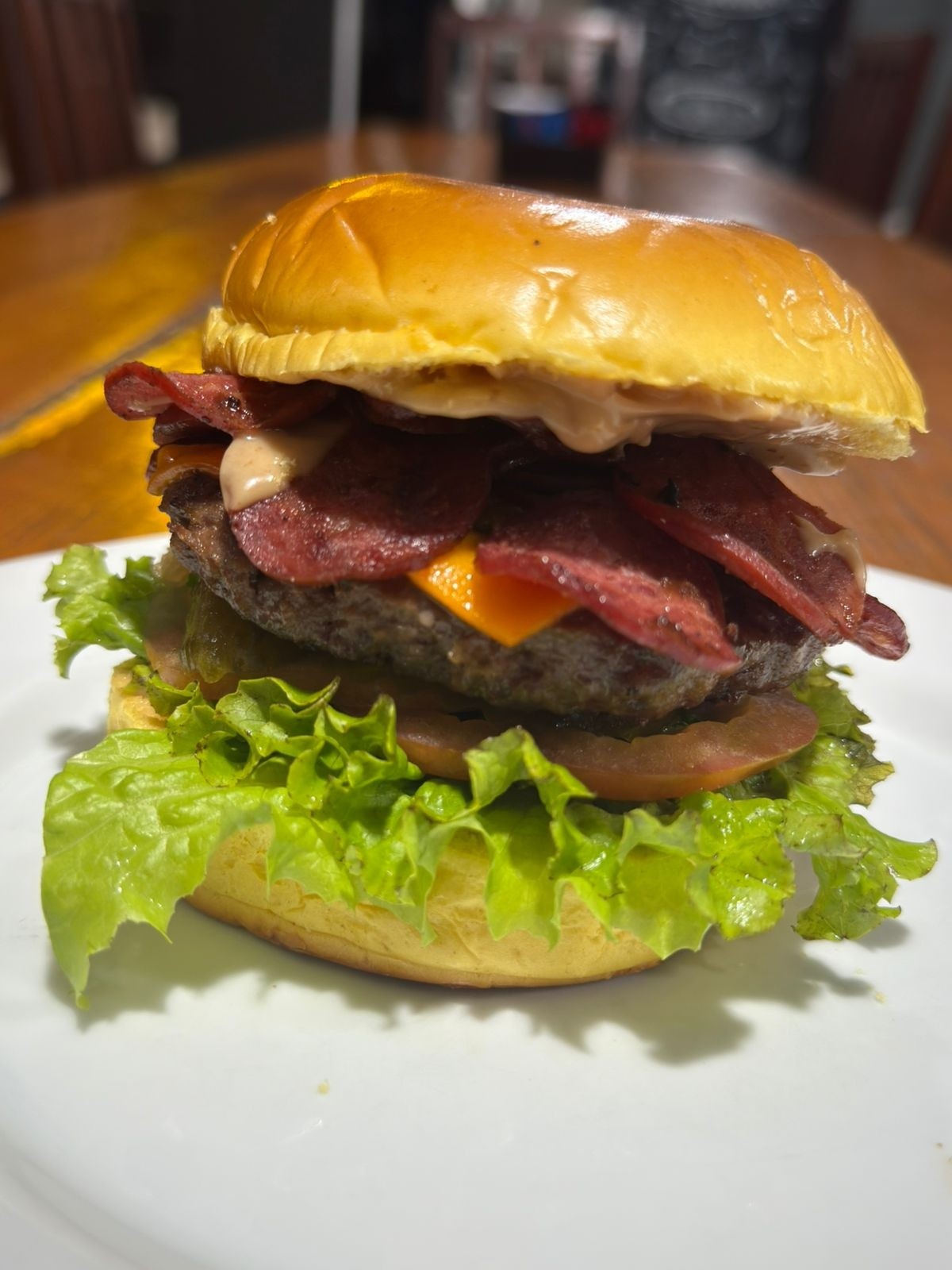 Pão, Hambúrguer de 150g, Queijo cheddar, Calabresa, Alface, Tomate, Picles, Molho rosé, Acompanha 150g de batata frita