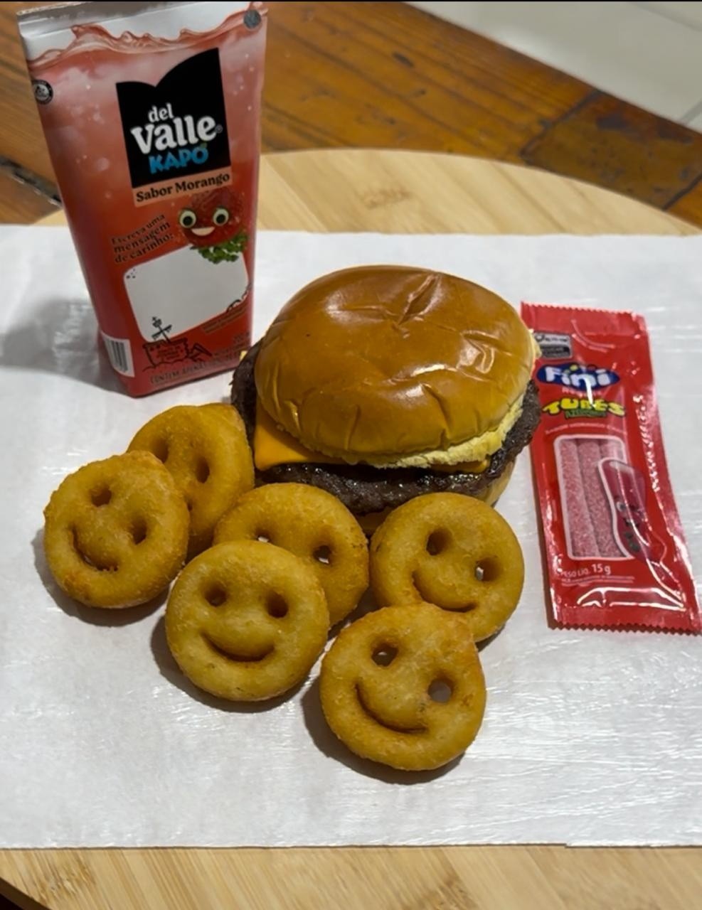 1 burguer clássico tradicional, 5 batatas sorriso, 1 suco Kapo, 1 pacote Fini