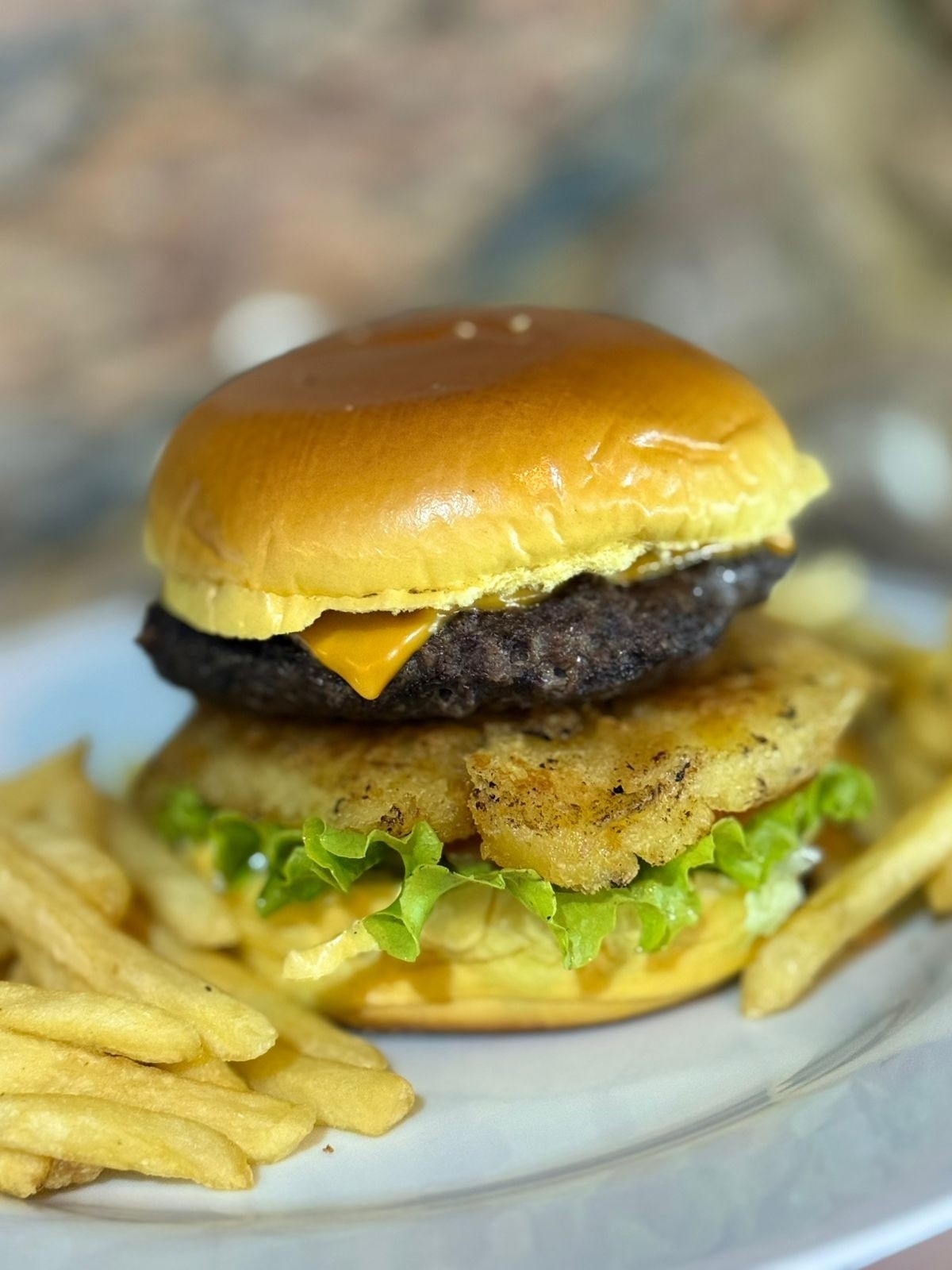 Pão, Hamburguer de Costela 140g, Alface, Tomate, Queijo cheddar fatiado, Mandioca (dentro do lanche), Maionese grill, Barbecue, Acompanha 150g de batata frita