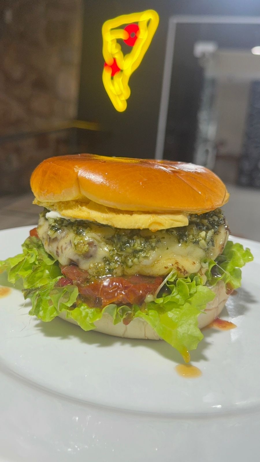 Pão, Alface, Tomate Seco, Hambúrguer de 150g, Mussarela, Pesto, Maionese grill, Acompanha 150g de batata frita
