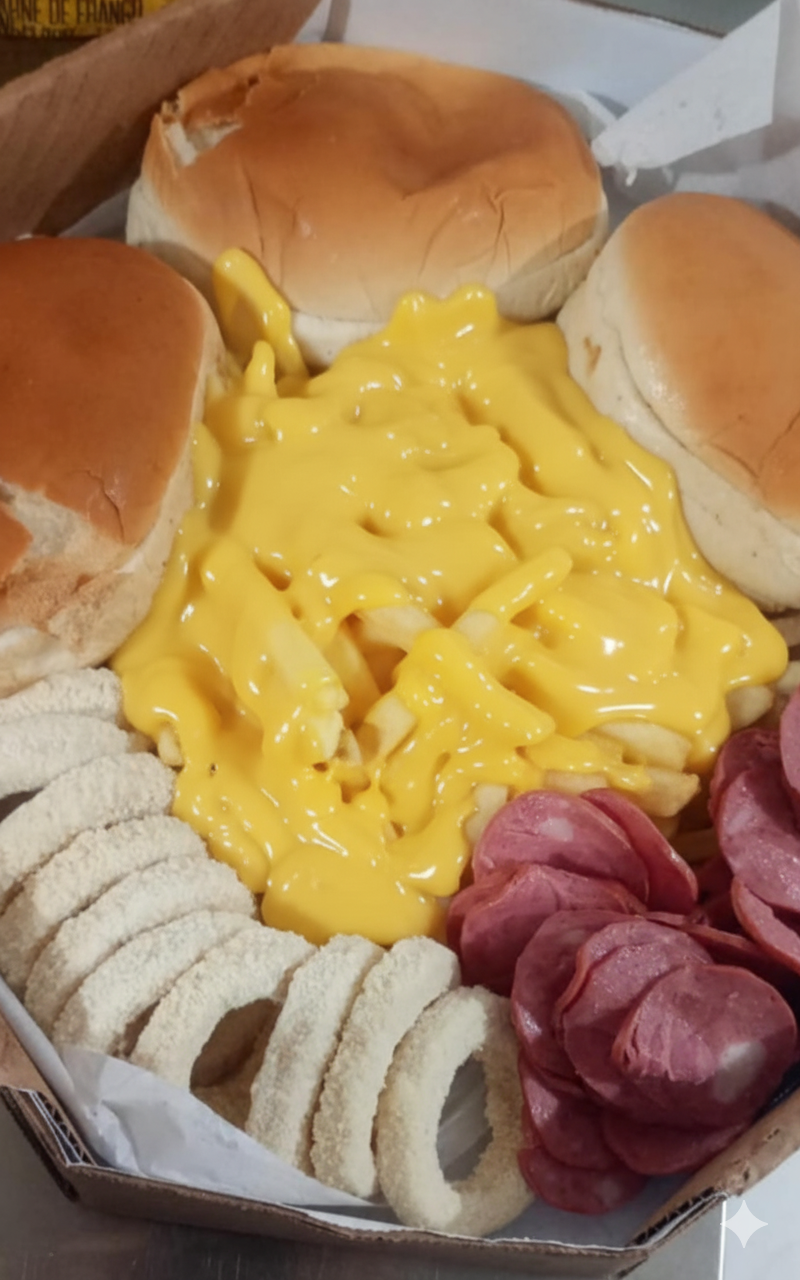 3 x Salada, Acompanha: 300g de batata frita coberta de cheddar, + 10 anéis de cebola + 150g de calabresa